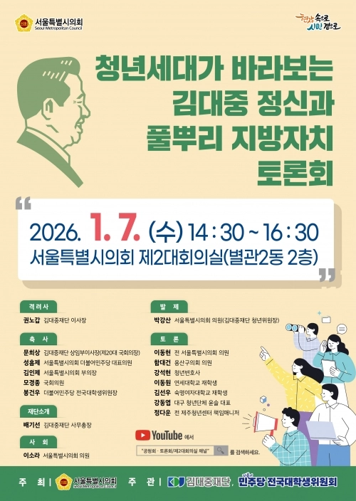 서울시의회 대변인 박강산 의원(더불어민주당·비례대표)이 2026년 1월 7일 14시 30분 서울시의회 제2대회의실에서 ‘청년세대가 바라보는 김대중 정신과 풀뿌리 지방자치 토론회’ 개최 소식을 전했다.