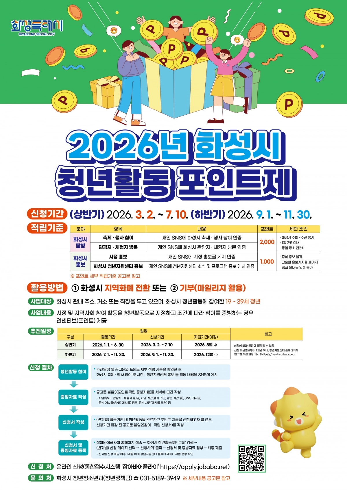 화성특례시(시장 정명근)는 청년의 시정 참여와 지역사회 활동을 지원하기 위해 오는 3월 2일부터 ‘2026년 청년활동포인트제’를 본격 시행한다고 9일 밝혔다.