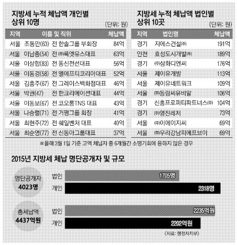 3000만원 이상 지방세를 1년 넘게 내지 않은 신규 고액 체납자 4023명의 명단이 14일 오전 각 시·도 웹사이트에 공개됐다. 6개월 이상 체납 사유를 소명하지 않은 개인 2318명(2202억원)과 법인 1705곳(2235억원)이다.