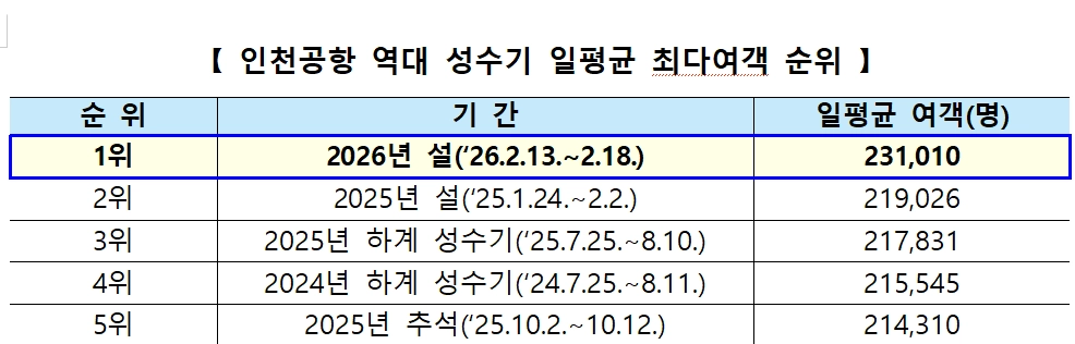 기존 명절 최다 실적은 지난해 설 연휴(2025년 1월 24일~2월 2일)에 기록한 21만 9026명으로 올해는 이보다 약 5.5% 증가했다. 2025년 하계 성수기(2025년 7월 25일~8월 10일) 일평균 21만 7831명과 비교하면 약 6.1% 늘었다.