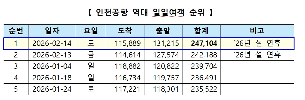 일일 여객 실적의 경우 13일 24만 2188명을 기록해 기존 최다 실적인 올해 1월 4일의 23만 9704명 기록을 경신했다. 이어 다음 날인 14일에는 이보다 7400명 증가한 24만 7104명을 기록하며 하루 전 경신한 역대 최고 기록을 또 한번 갈아치웠다. 인천공항 개항(2001년 3월 29일) 이후 일일 여객이 24만 명을 넘은 것은 처음이다.